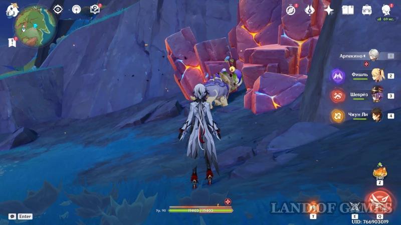 Управление Ашей во многом схоже с управлением заврианами, но с некоторыми отличиями: вместо элементального навыка (E) Аша использует способность юмказавра, а обычная атака позволяет выстреливать краской. При удержании кнопки атаки Аша переходит в режим прицеливания, непрерывно выпуская потоки краски. В этом режиме вы также увидите шкалу выбранного цвета; когда она опустошится, использование этого цвета временно станет невозможным, но шкала быстро восстановится.