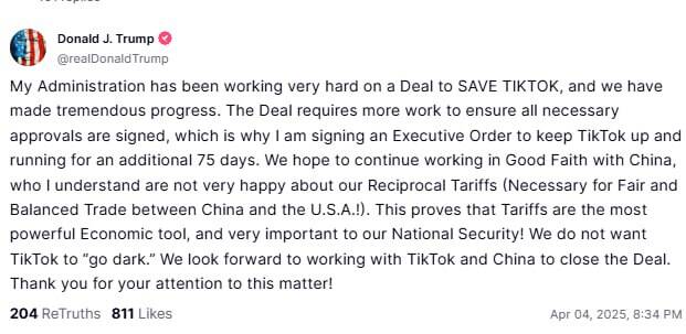 «Моя администрация активно работала над соглашением по TikTok, и мы достигли значительного прогресса. Для завершения сделки требуется дополнительная работа и подписание всех необходимых документов, поэтому я подписываю указ о продлении работы TikTok еще на 75 дней», — заявил президент.
