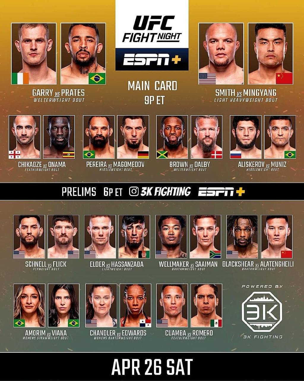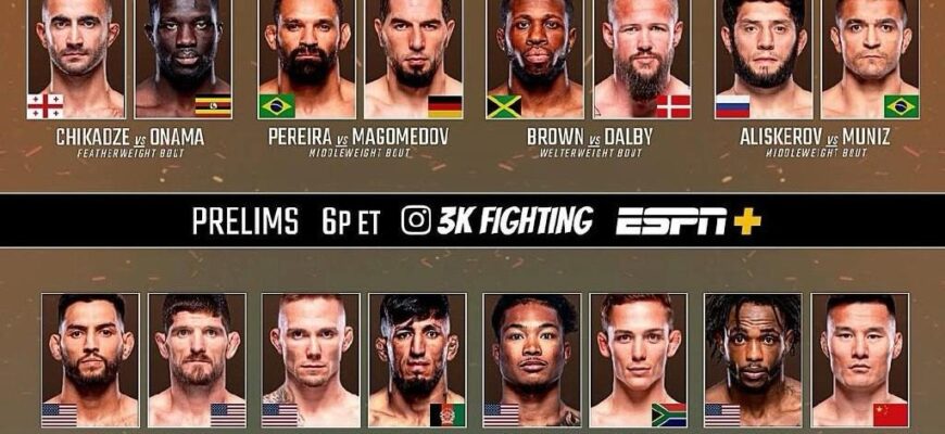 Турнир по смешанным единоборствам UFC on ESPN 65 состоялся в ночь на 6 апреля в Лас-Вегасе, США. Согласно официальному расписанию, трансляция предварительных поединков началась в 01:00 по московскому времени, а бои основного карда стартовали в 04:00. Мероприятие транслировалось, в частности, на платформе Setanta.